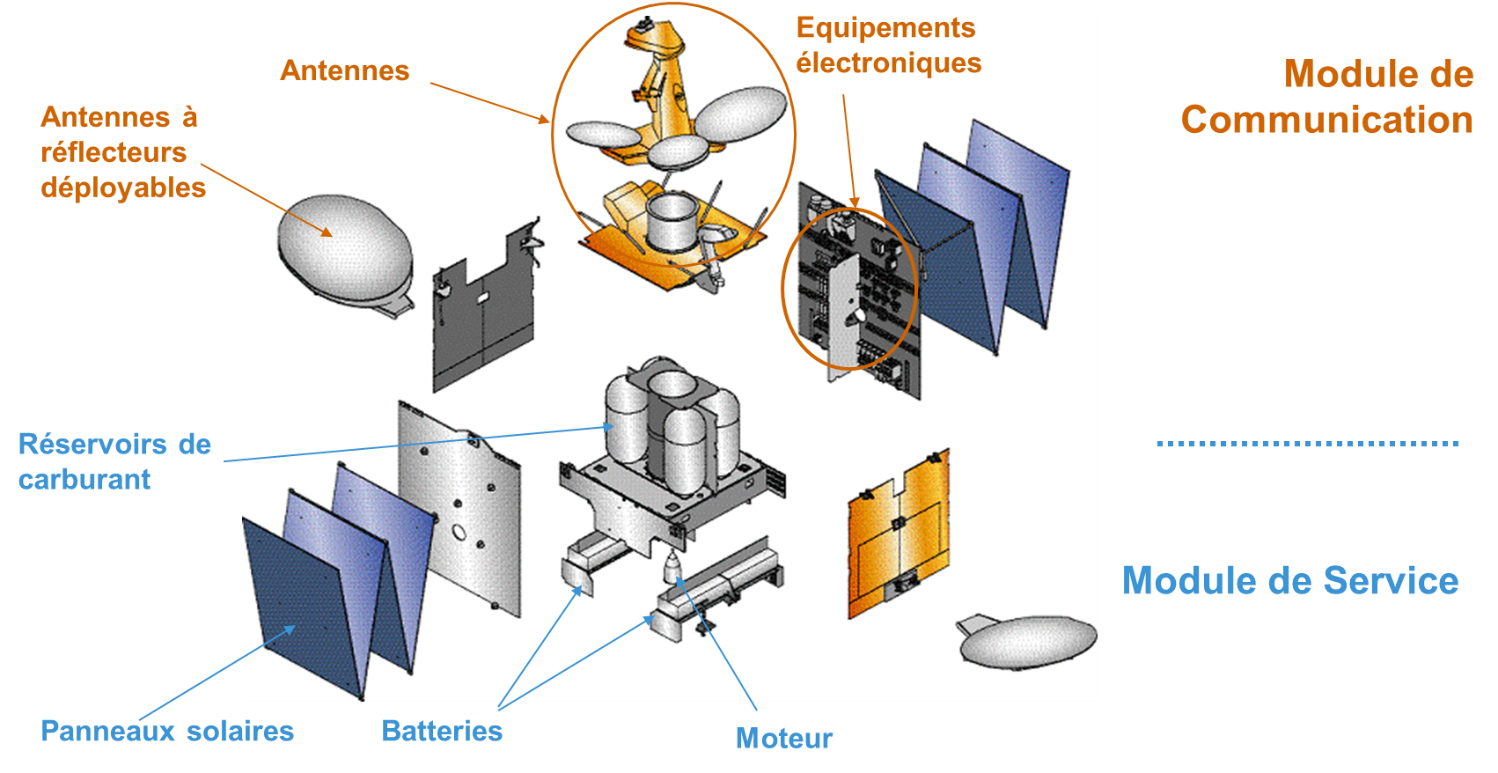 Tout satellite possède une charge utile (par exemple un module de communication pour les satellites de télécommunication), constituée par les instruments liés aux objectifs de la mission et une plateforme de service (ou module de service) comportant tout ce qui est nécessaire pour assurer le bon fonctionnement des instruments pendant la durée de vie prévue.