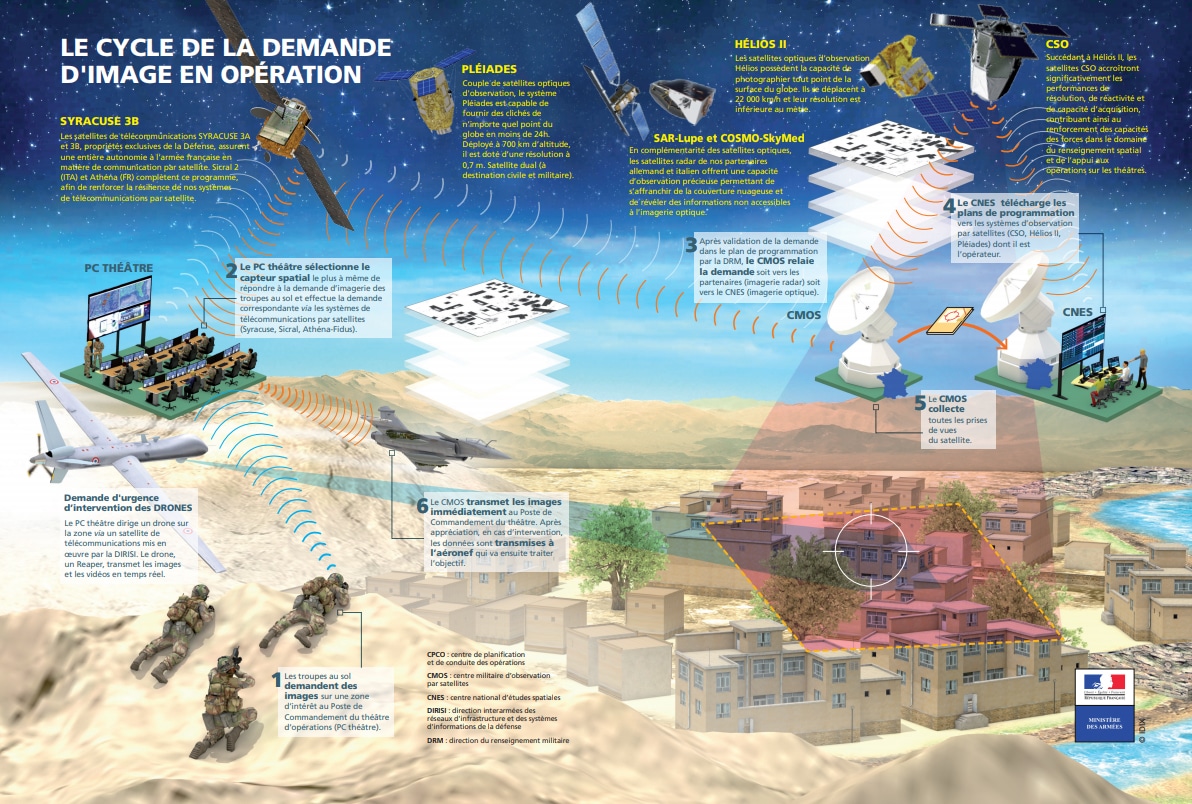 Le programme militaire français Syracuse, composé d’une série de satellites de télécommunication, permet de relier les unités entre elles quelle que soit leur position sur la planète. Ces communications sont sécurisées et résistantes à la menace de guerre électronique.